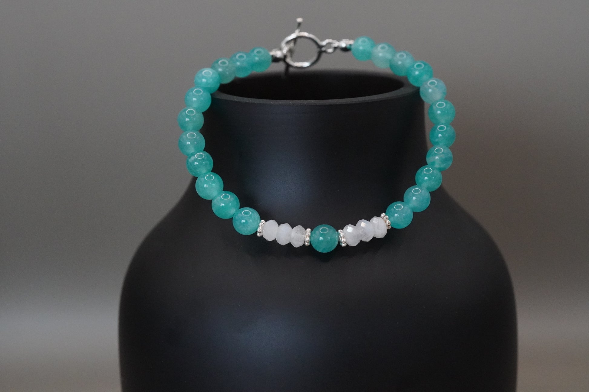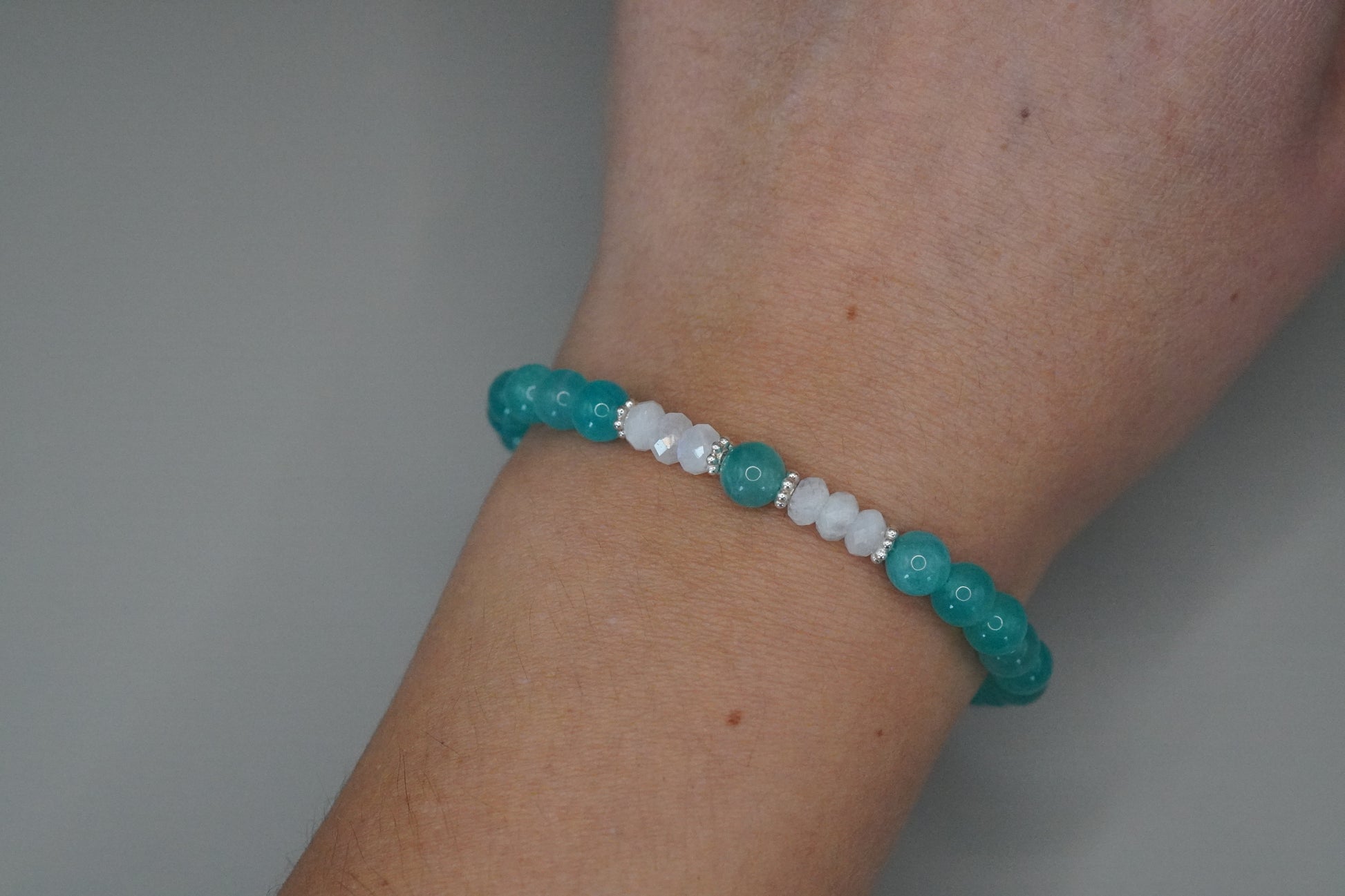Linda pulsera de cuentas de amazonitas y piedra luna con separadores de plata. Tiene un broche de plata 0.925 y mide aprox 18cm