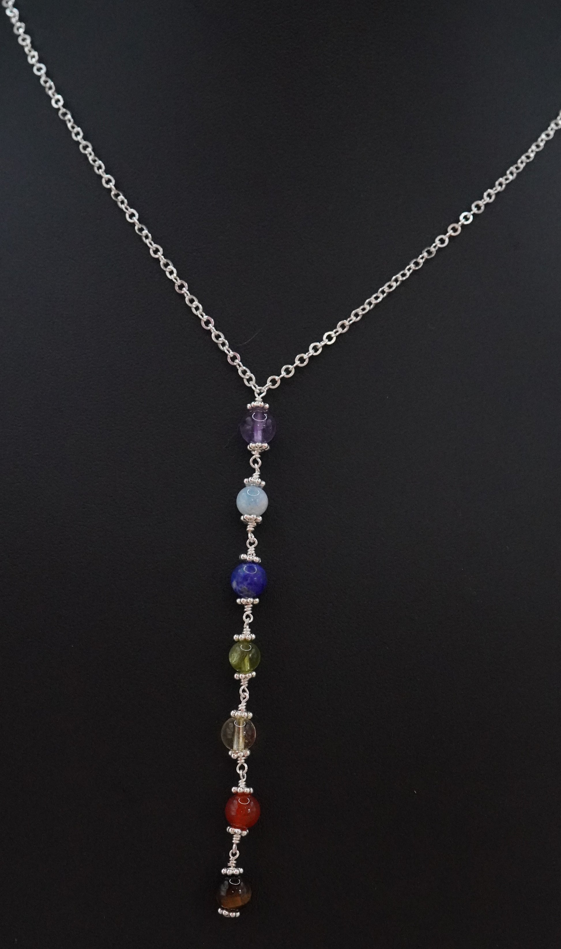 Un collar largo, sin broche, entra por la cabeza facilmente. Con plata 0.925 y cuentas de colores: Amatista, aguamarina, lapis lazuli, peridot, citrino, cornalina, ojo de tigre.
