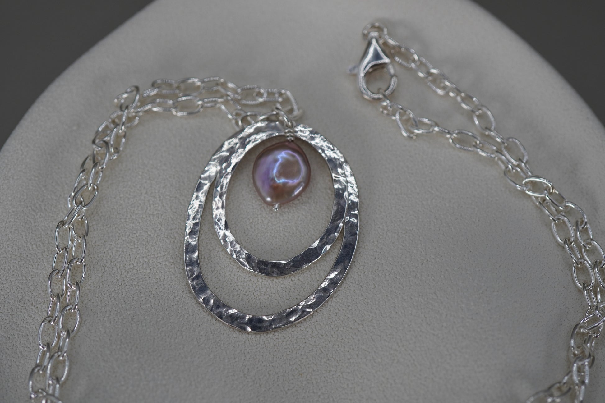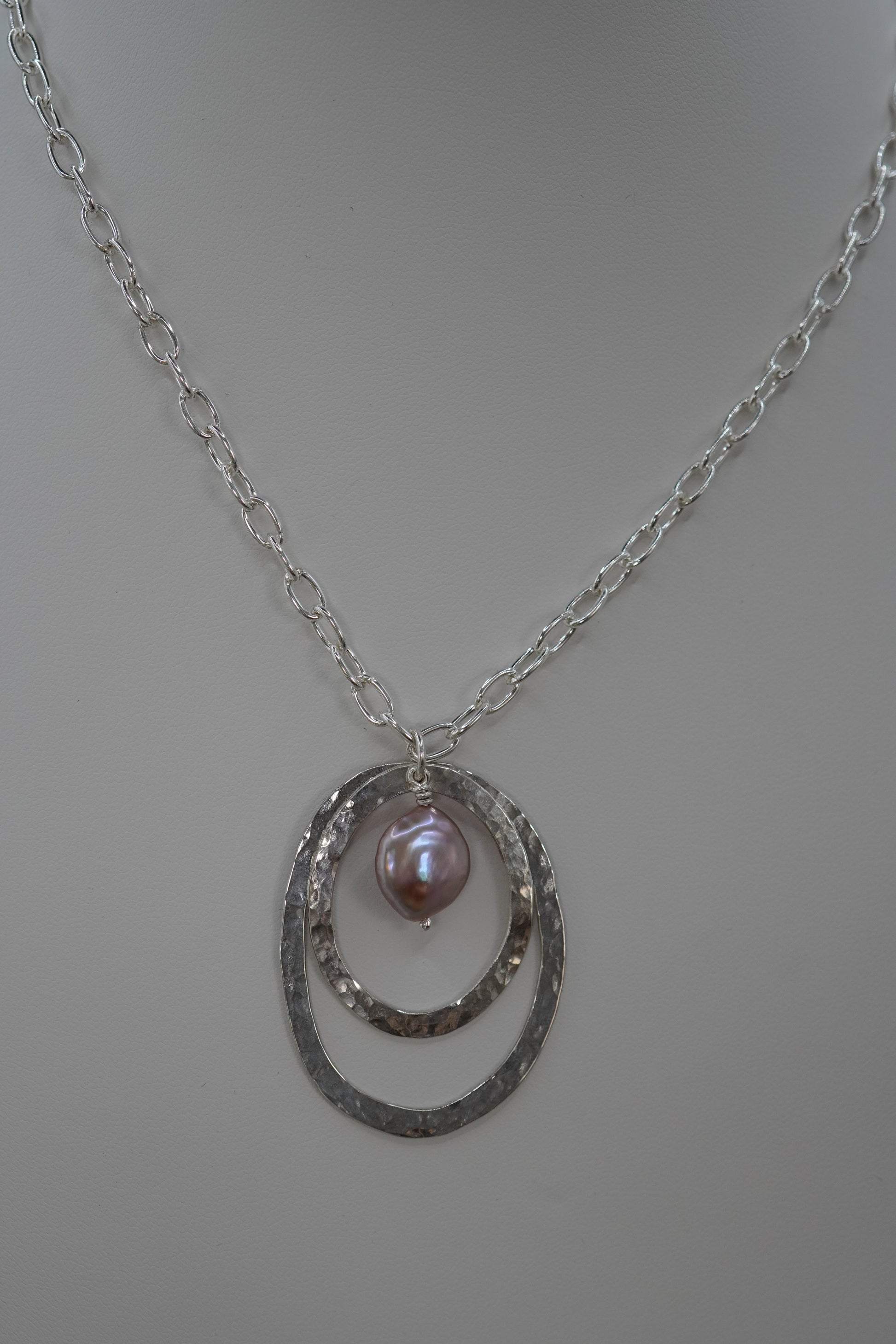 Collar hermoso de aros de plata 0.925 martillados con una perla en forma de moneda color café que cuelga, dando movimiento y elegancia. Se puede usar en diferentes largos, lo más largo son 73.5cm.