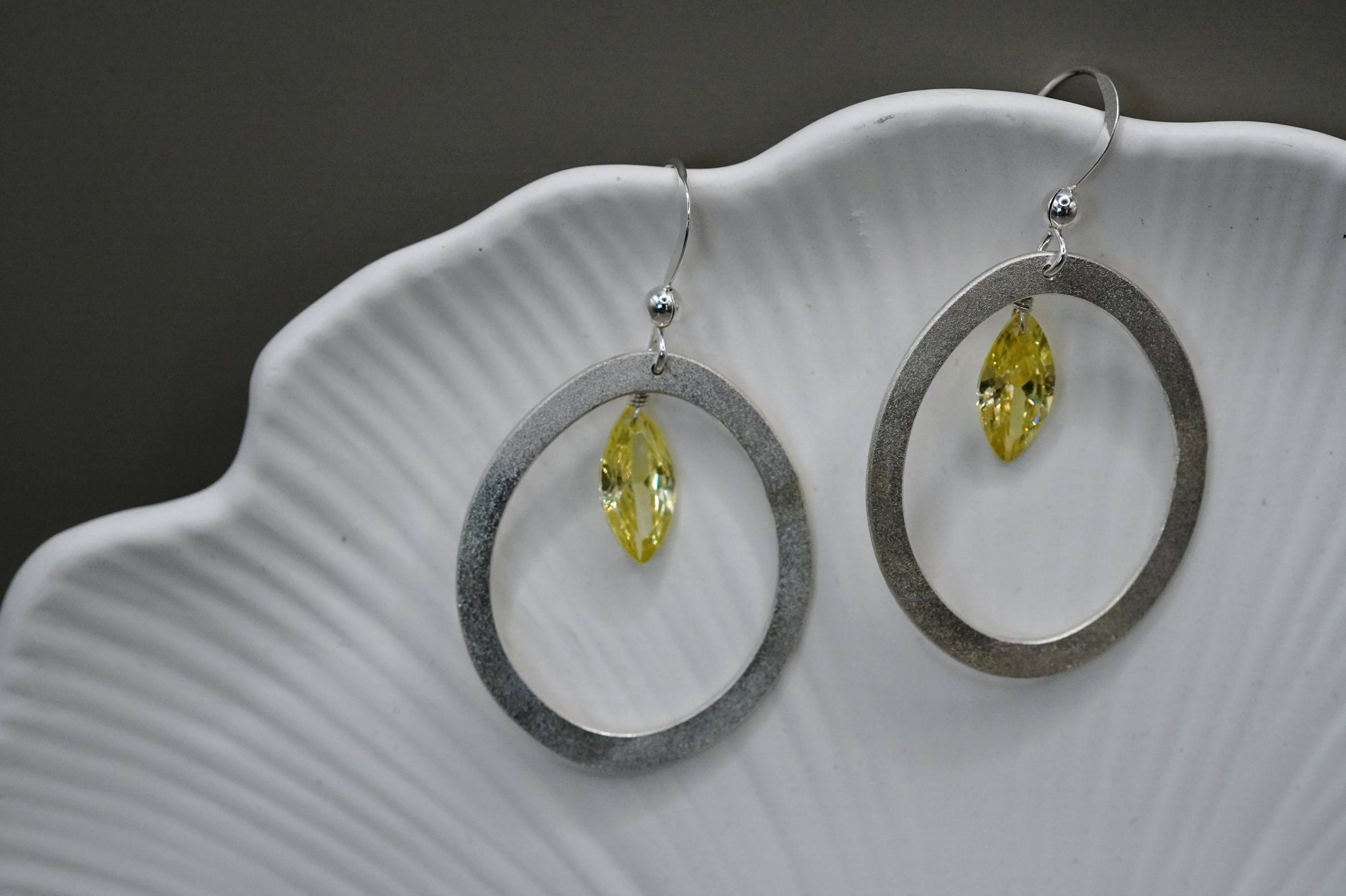 Ohrringe in Ovalform aus 925er Silber mit mattem Finish und wunderschönen, hängenden gelben Zirkonia. Länge ca. 4,5 cm.