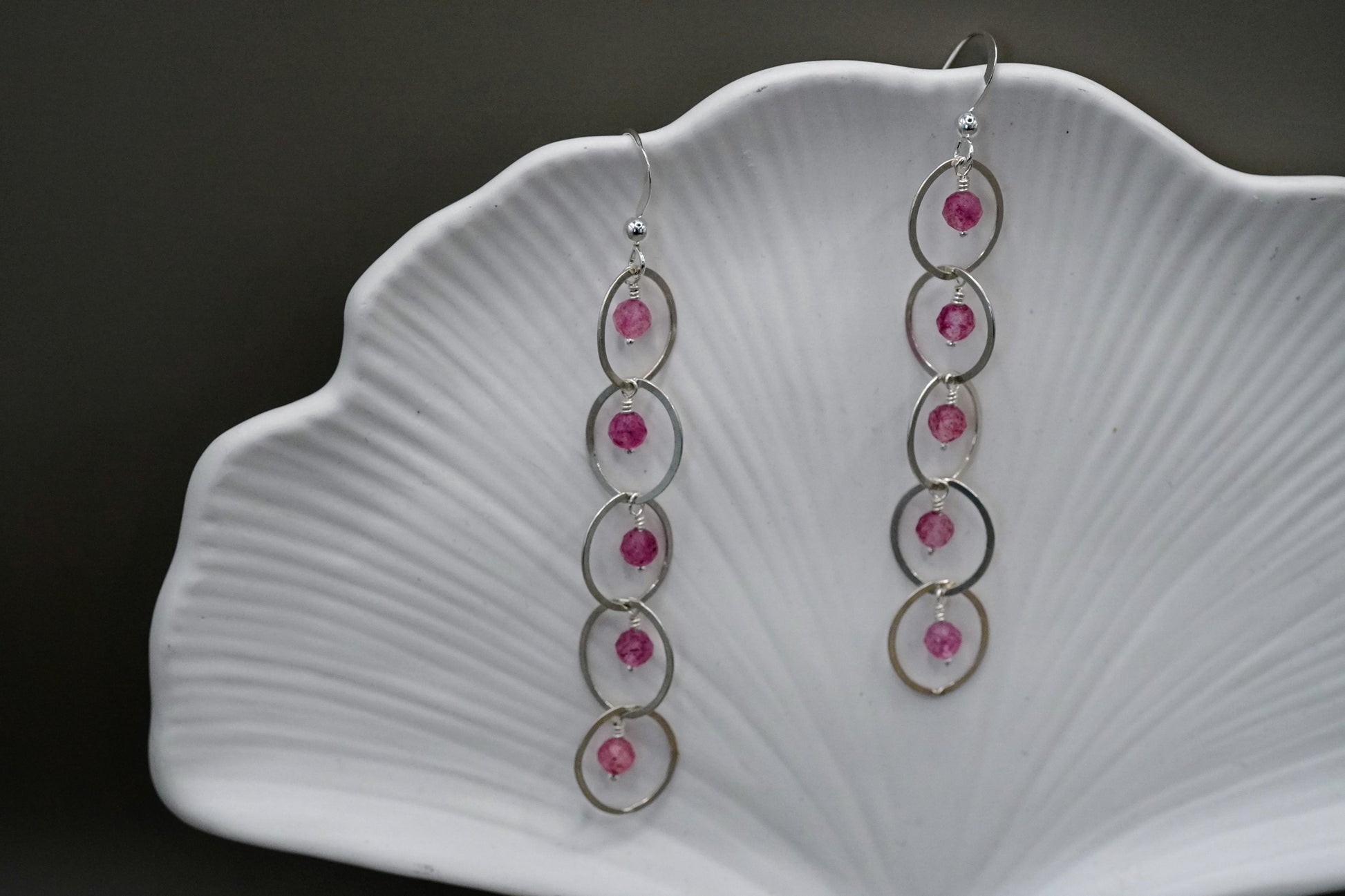 Hermosos aretes largos de anillitos ovalados de plata con cuentas de cuarzo rosa fresa. Cuelgan aproximadamente 7.5cm