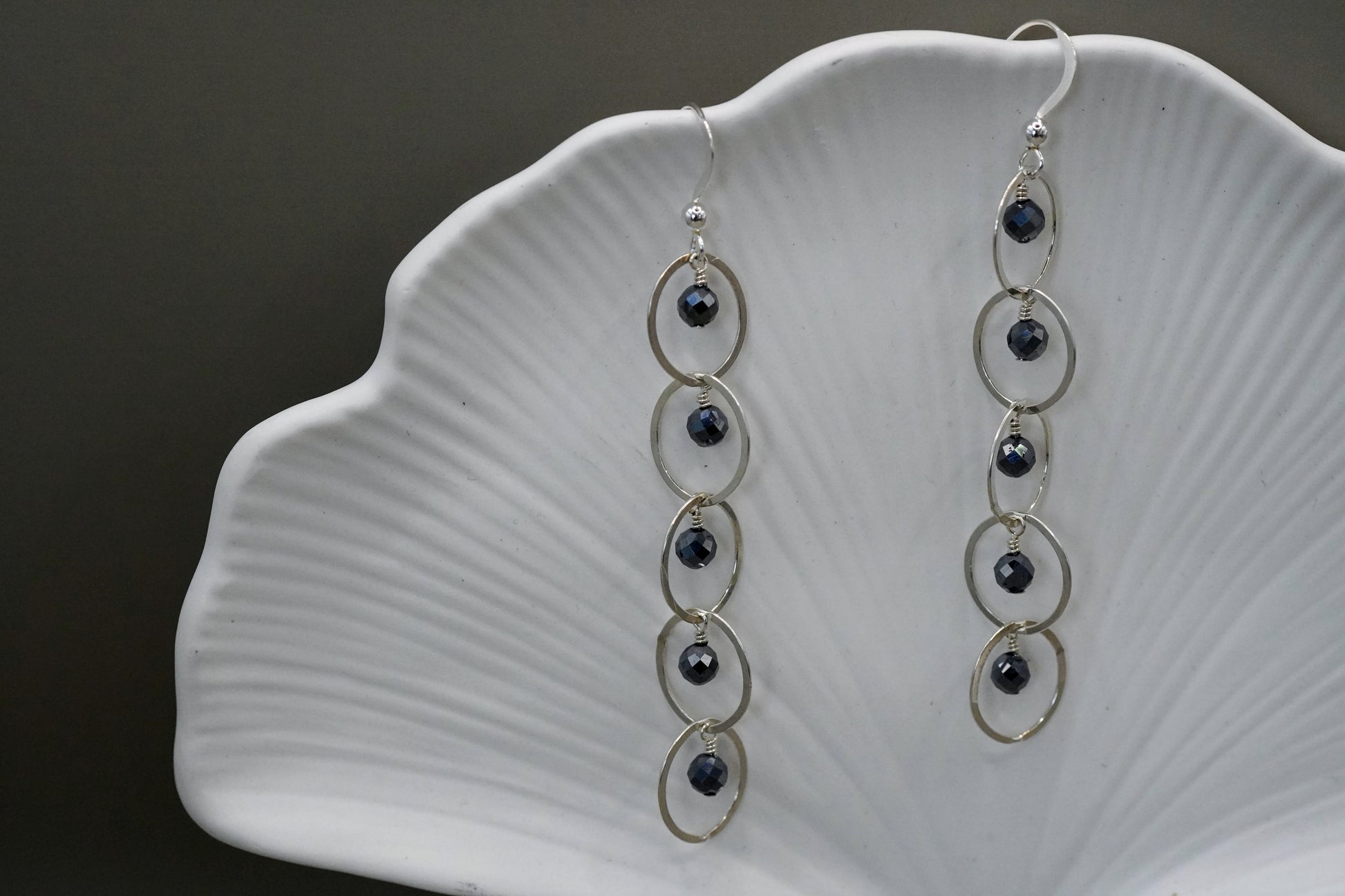 Hermosos aretes largos de anillitos ovalados de plata con cuentas de teraherz. Cuelgan aproximadamente 7.5cm