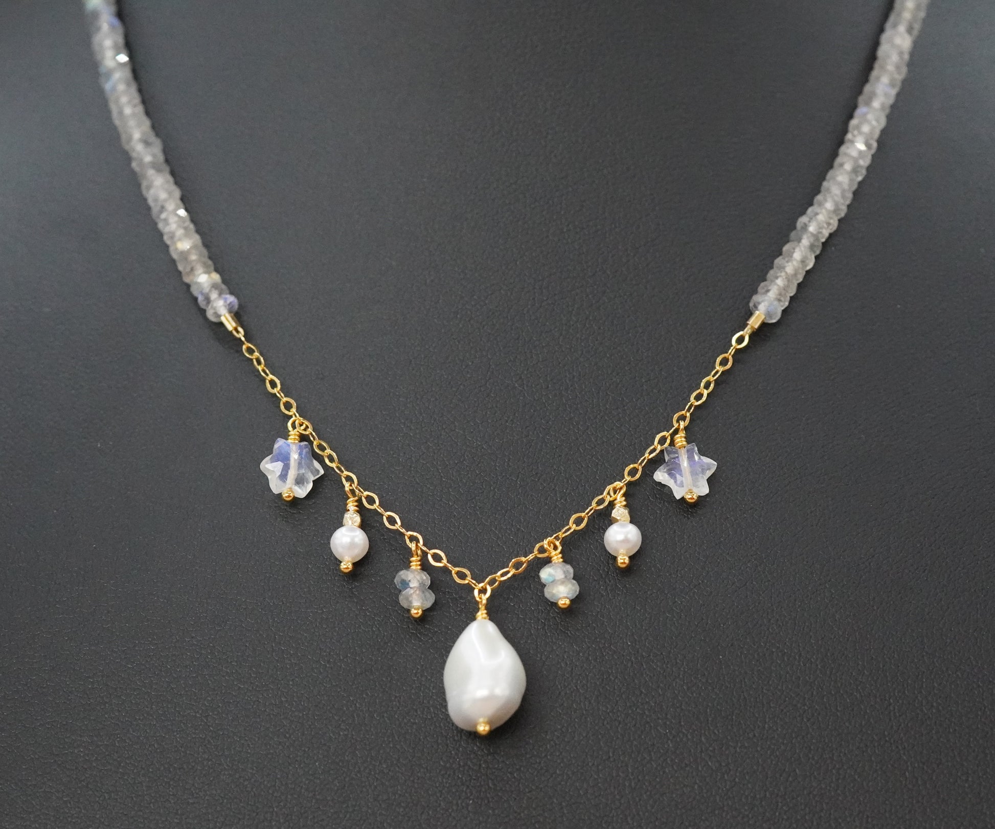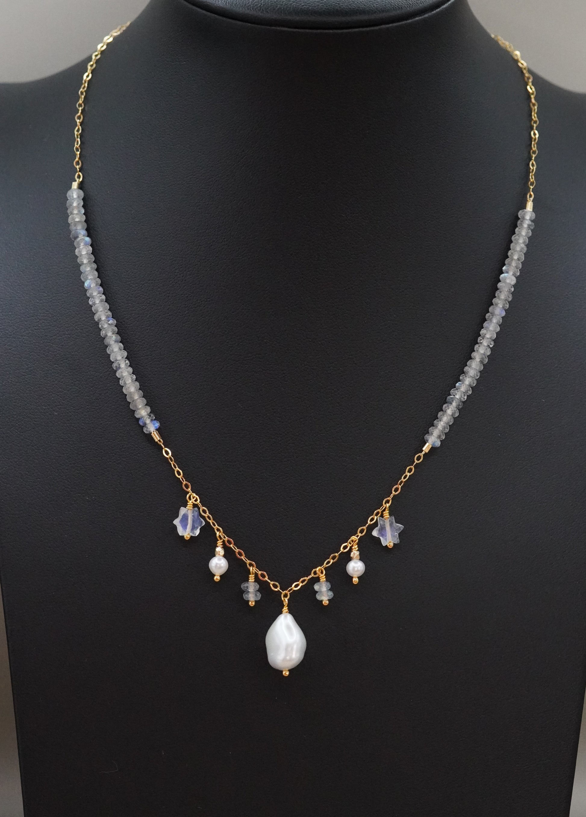Hermoso collar de plata con baño de oro adornado con impresionantes de cuentas de labradorita, estrellas de piedra luna y perlas de agua dulce. Este collar definitivamente dará un toque moderno y muy especial a tu look.