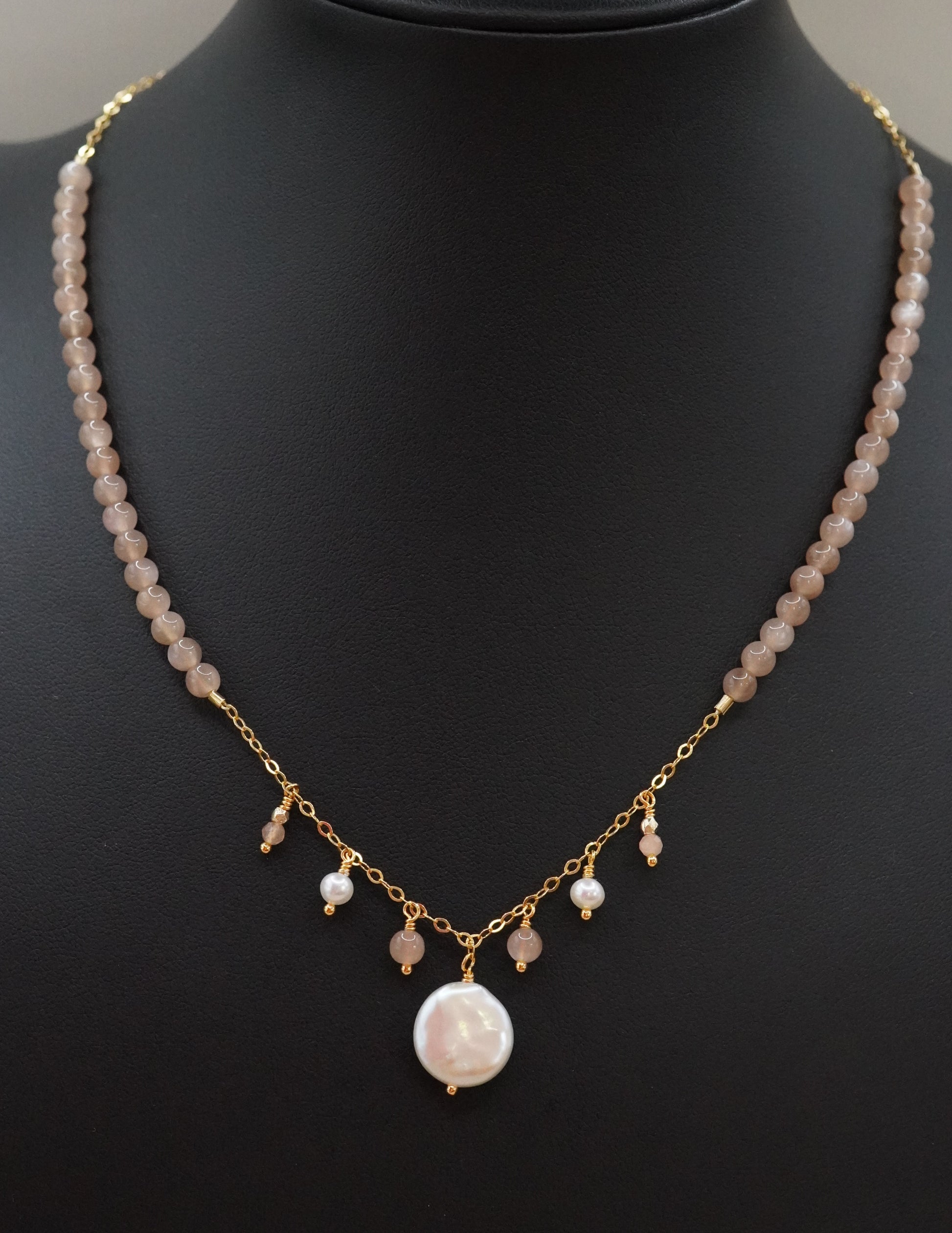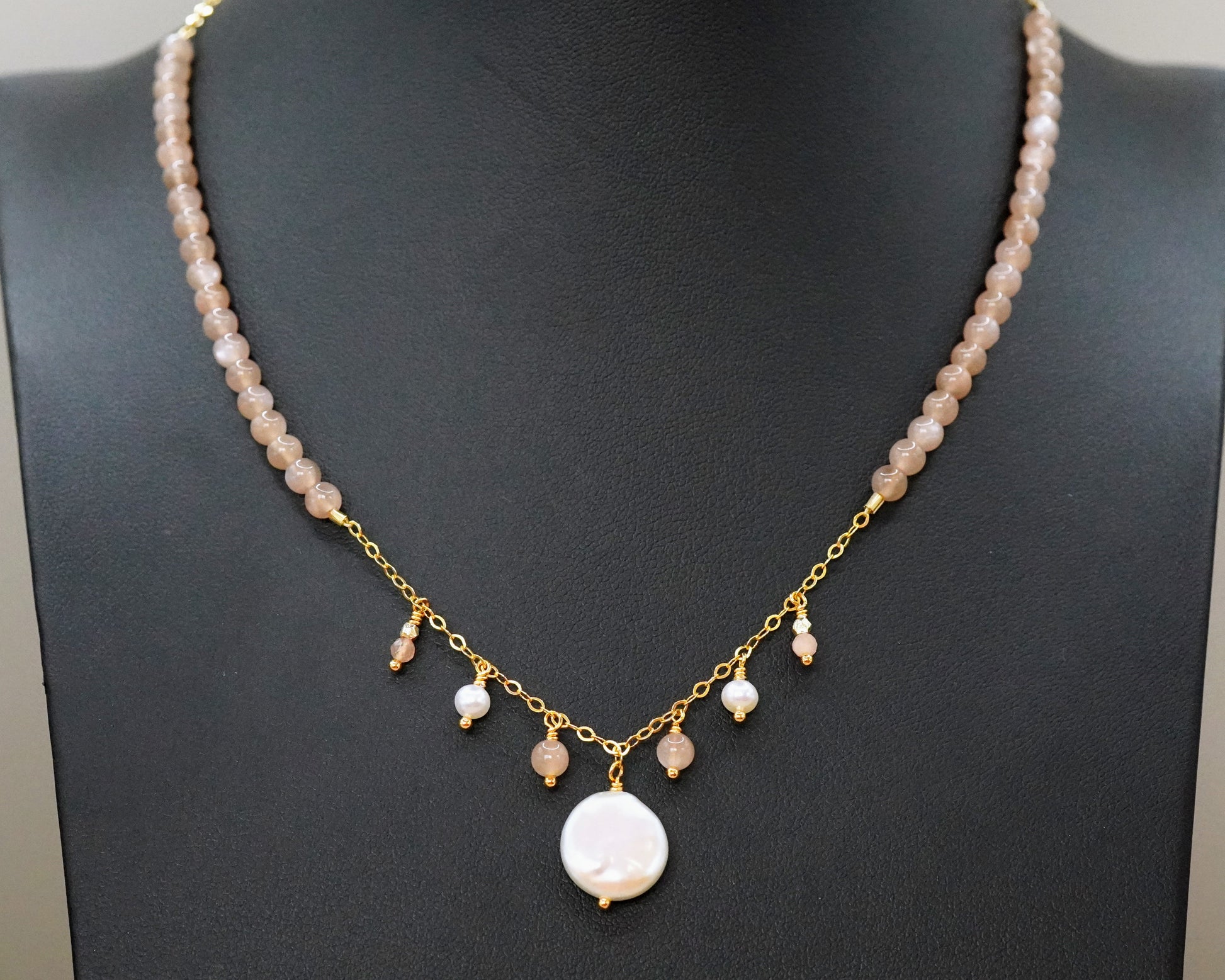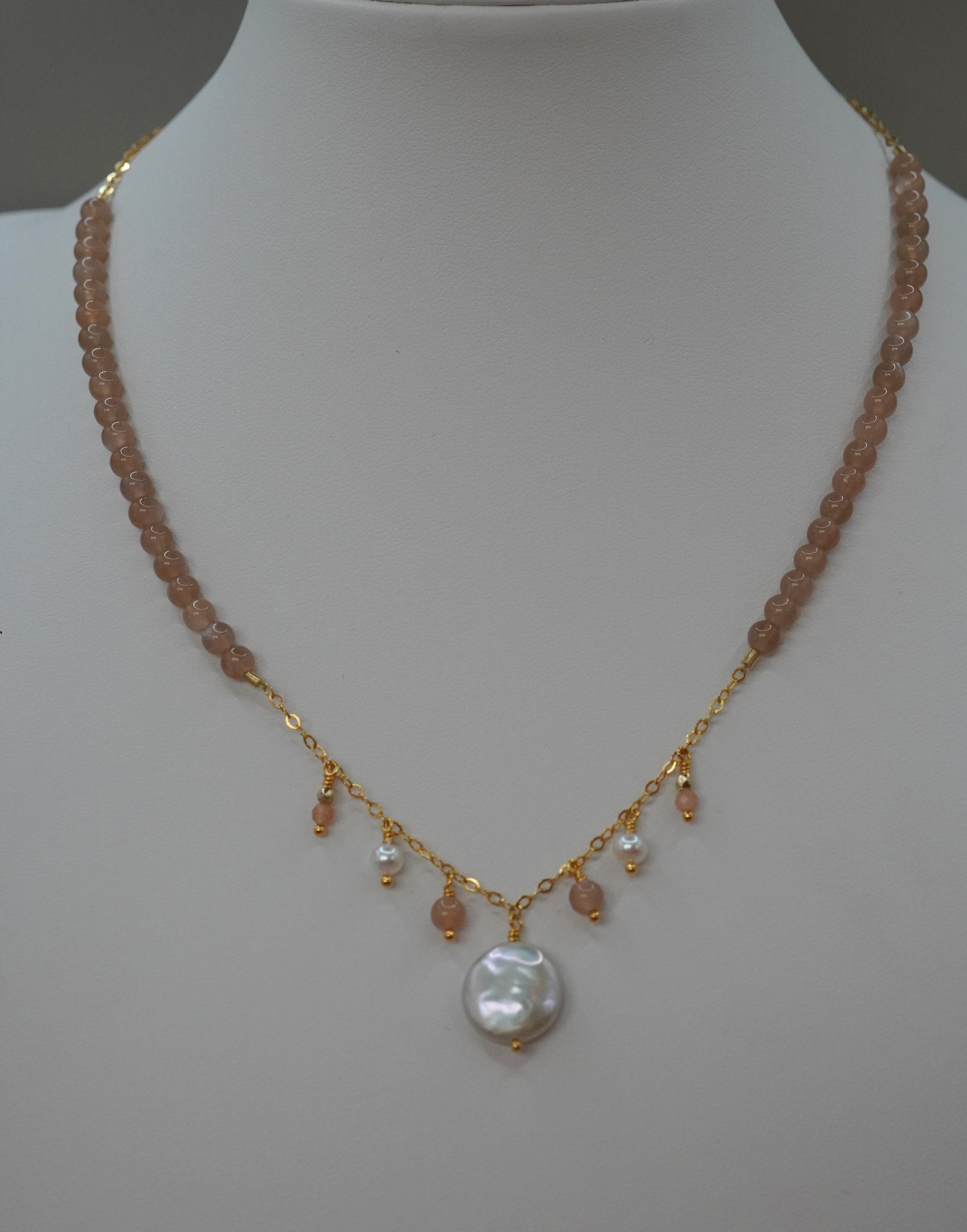 Hermoso collar de plata con baño de oro adornado con impresionantes de cuentas de piedra del sol, mini piedra luna tono caramelo y perlas de agua dulce. Este collar definitivamente dará un toque moderno y muy especial a tu look.