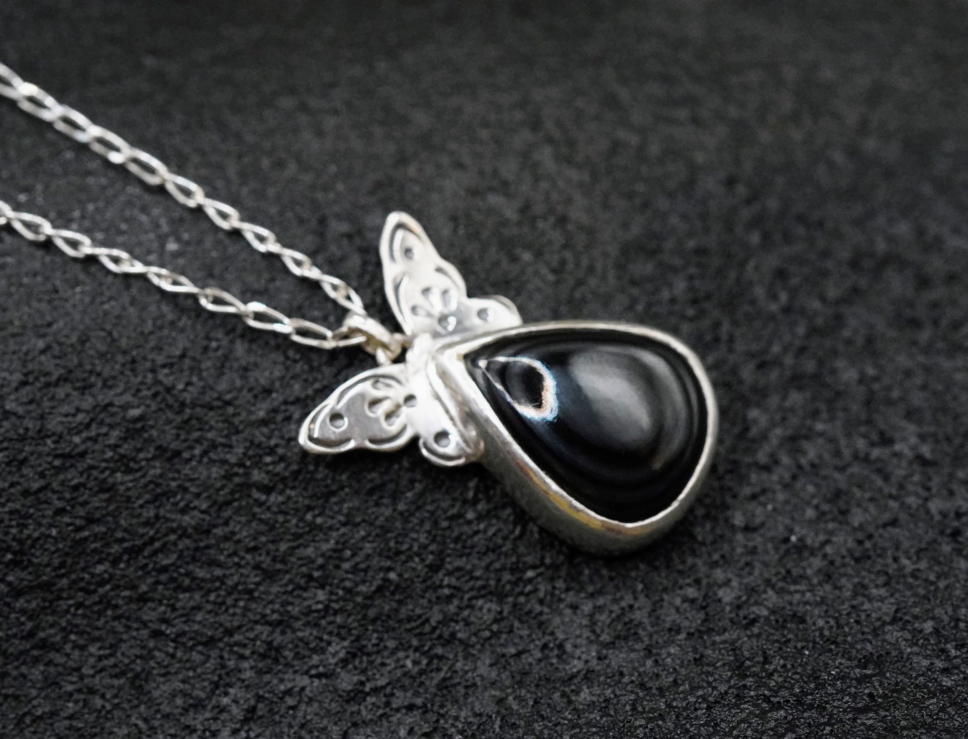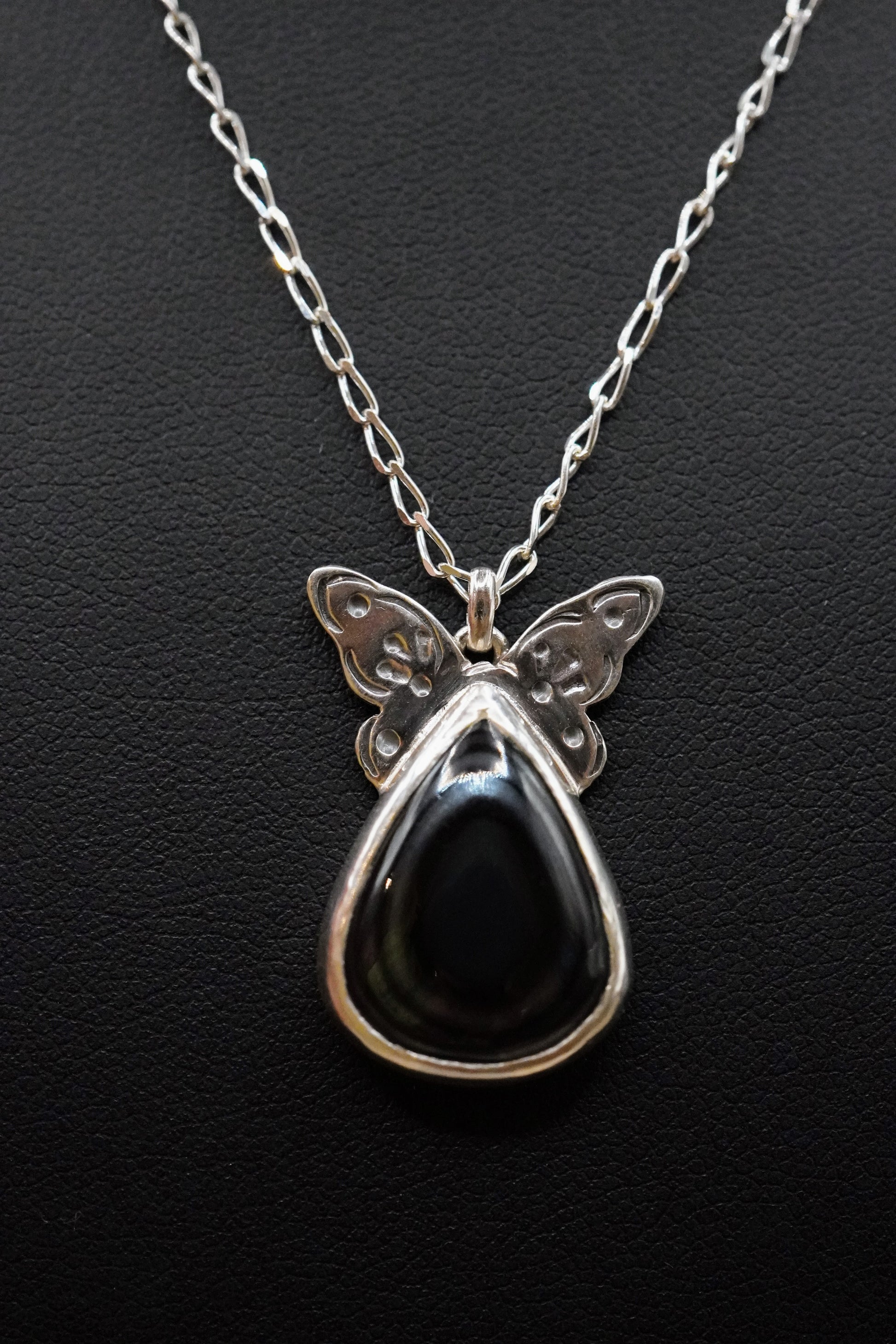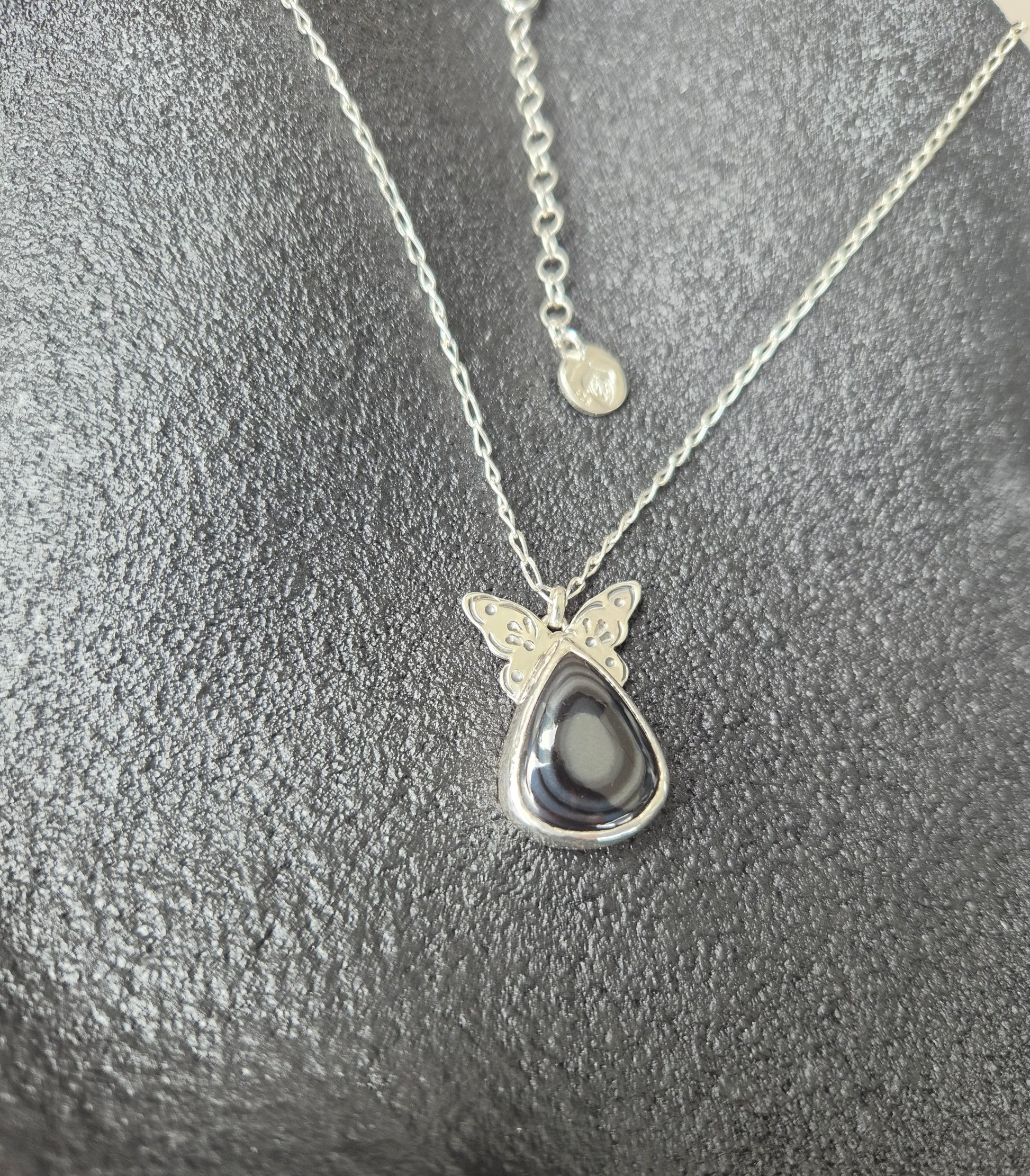 Collar hecho a mano en una exquisita combinación de Plata 0.925 y 0.999, destacando un espectacular Psilomelano. En esta pieza se captura la belleza atemporal de la mariposa, un poderoso símbolo de transformación, libertad y el alma humana. El Psilomelano añade un brillo profundo y una textura visual intrigante que realza la elegancia del diseño.