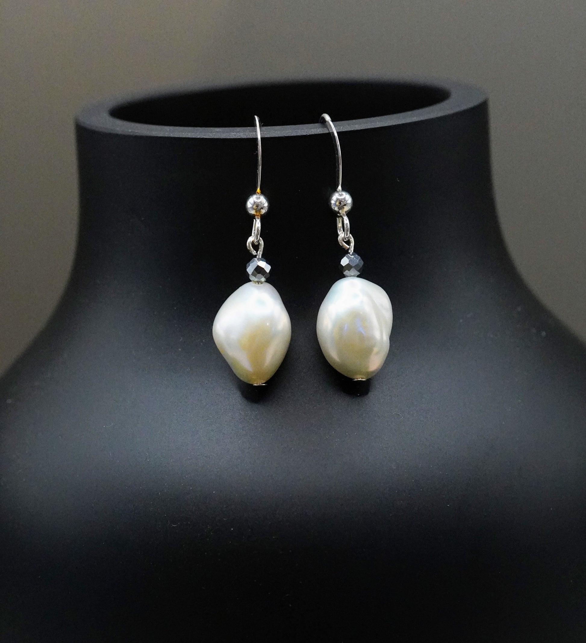 Hermosos aretes con perla de agua dulce irregulares, cada una es única y una mini hematita facetada que da brillo. Los ganchos son de plata 0.925.