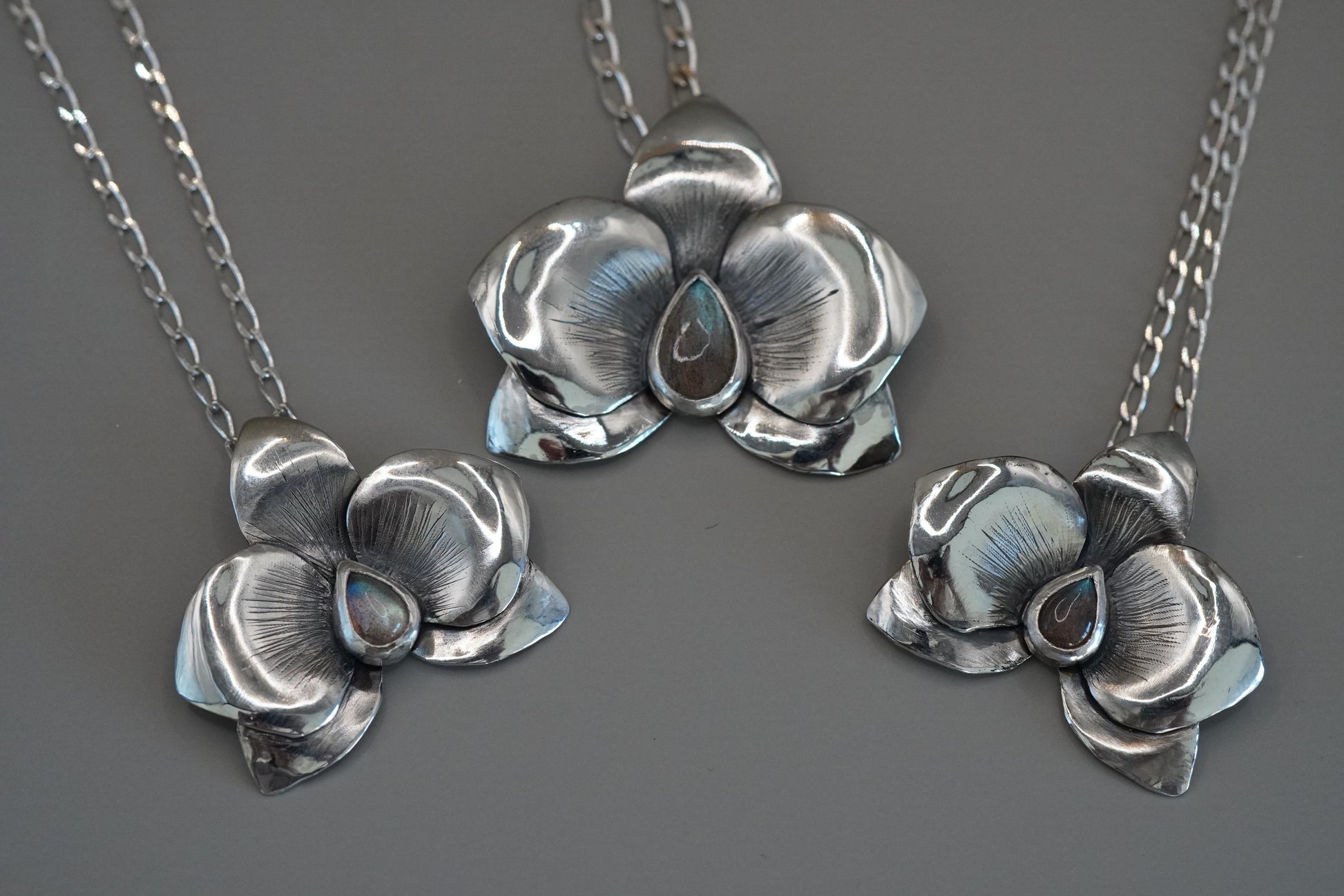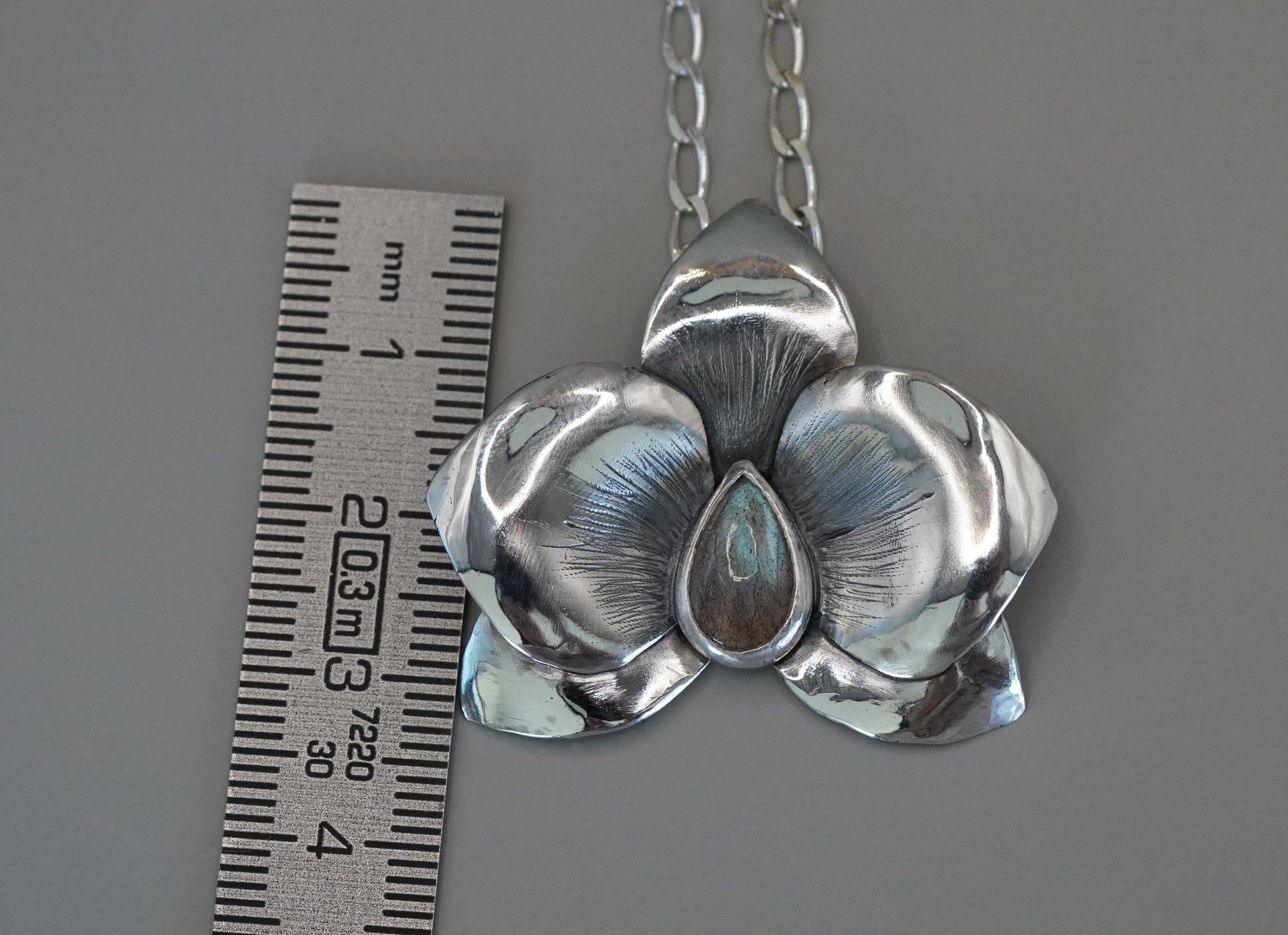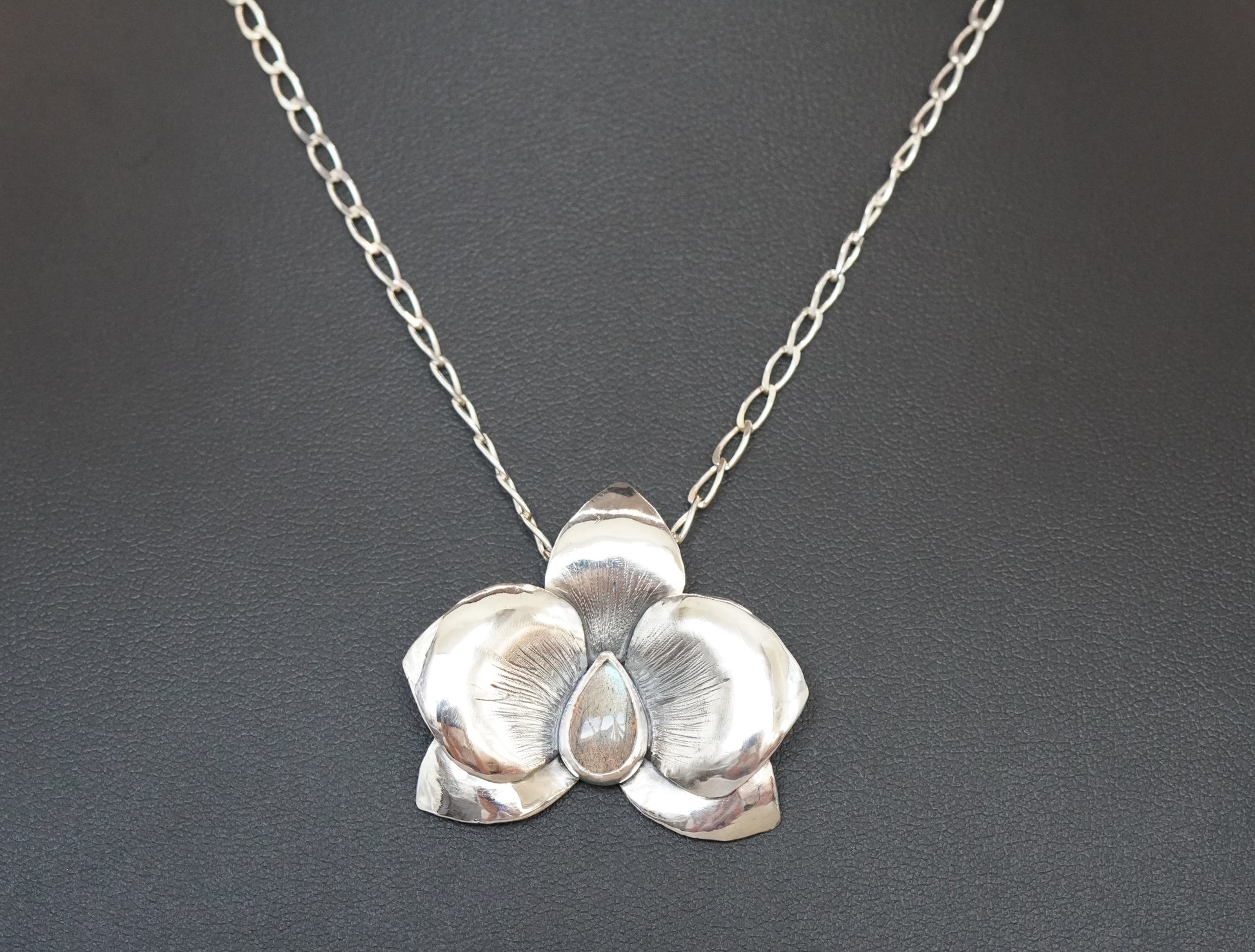 Precioso collar con una orquídea hecha a mano con plata 0.925 y 0.999 para el engaste de la labradorita, la cual es una piedra protectora que estimula la intuición y promueve la concentración y creatividad, es ideal para momentos de transformación. Me encanta representar la orquídea ya que es una flor muy elegante, especial y es ideal para regalar. Mide de 47cm a 54cm con cadena alargadora. Dije mide 5.8 x 3.4cm