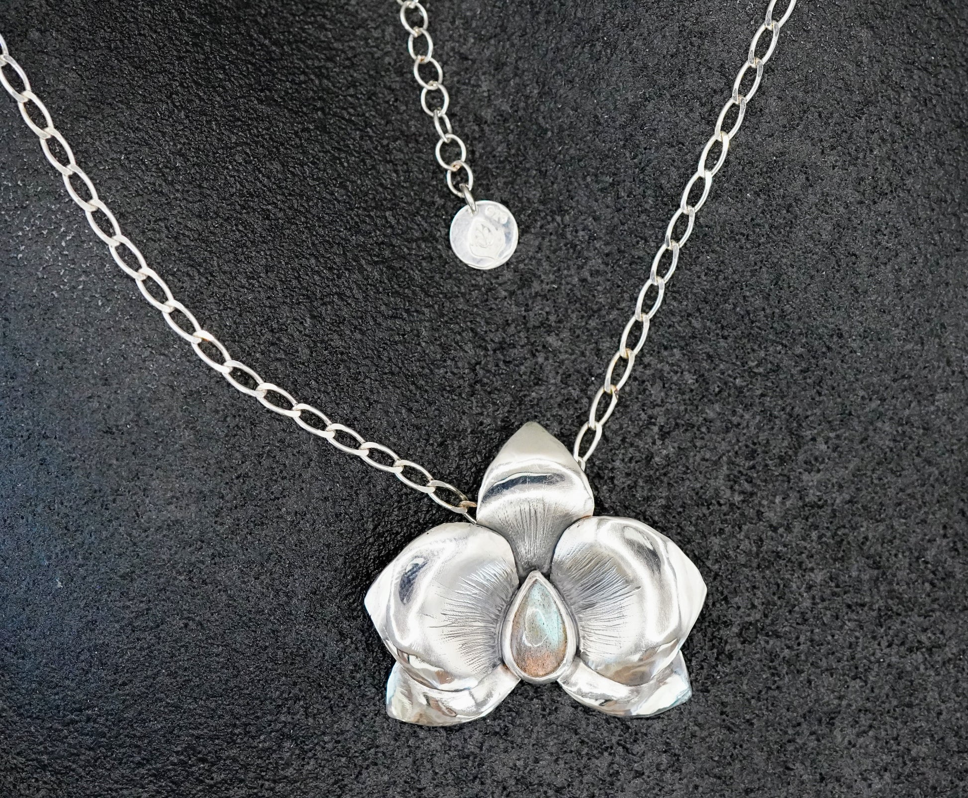 Handgefertigte Silberhalskette 0.925/0.999 mit einem eleganten Orchideen-Anhänger, gefasst mit einem Labradorit. Der Labradorit ist bekannt als Schutzstein, der die Intuition stärkt und die Kreativität in Zeiten des Wandels fördert. Die Orchidee, ein Symbol für Eleganz, macht dieses Schmuckstück zum perfekten Geschenk.
