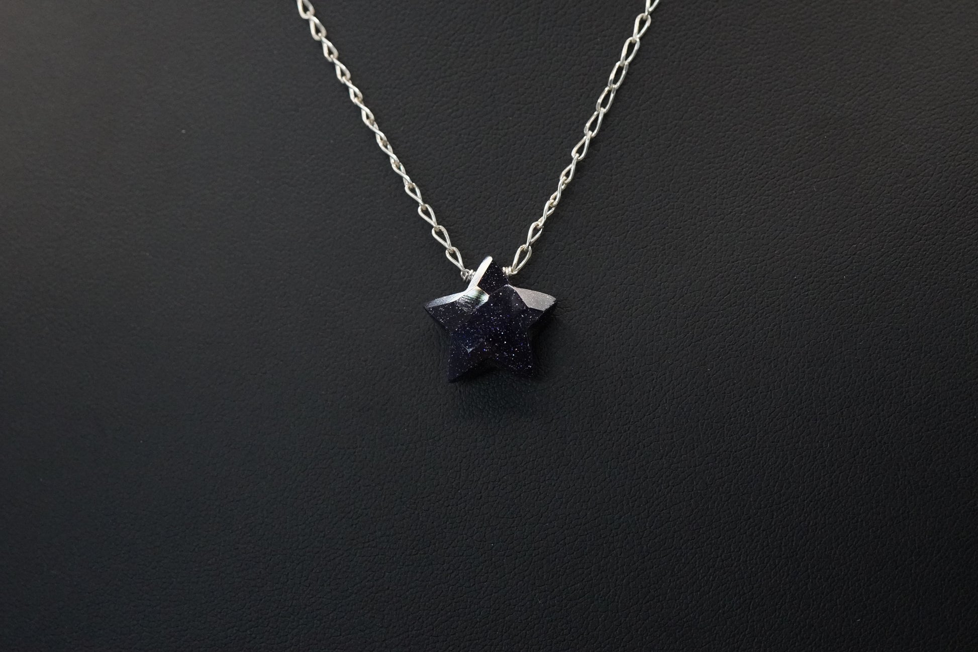 Collar de plata 0.925 muy sencillo, moderno y chic con una estrella de Goldstone azul de 1.5cm. Nota importante: Cada estrella es única, todas son diferentes y por su origen natural puede verse diferente que en las fotos. Tamaño aproximado de 41 a 46.5 con cadena alargadora.