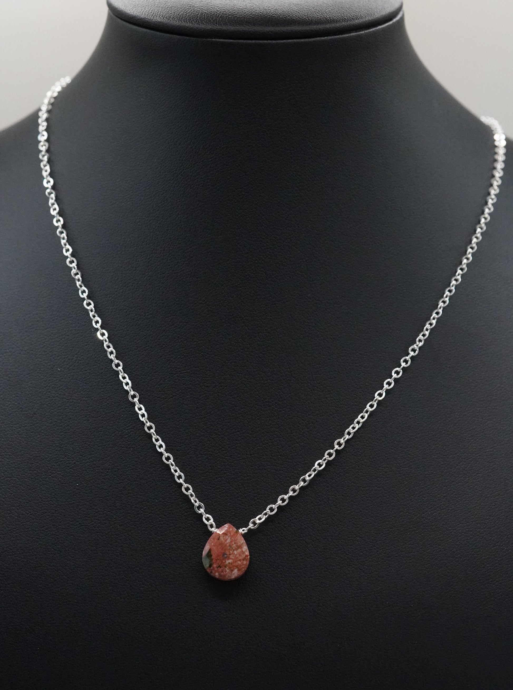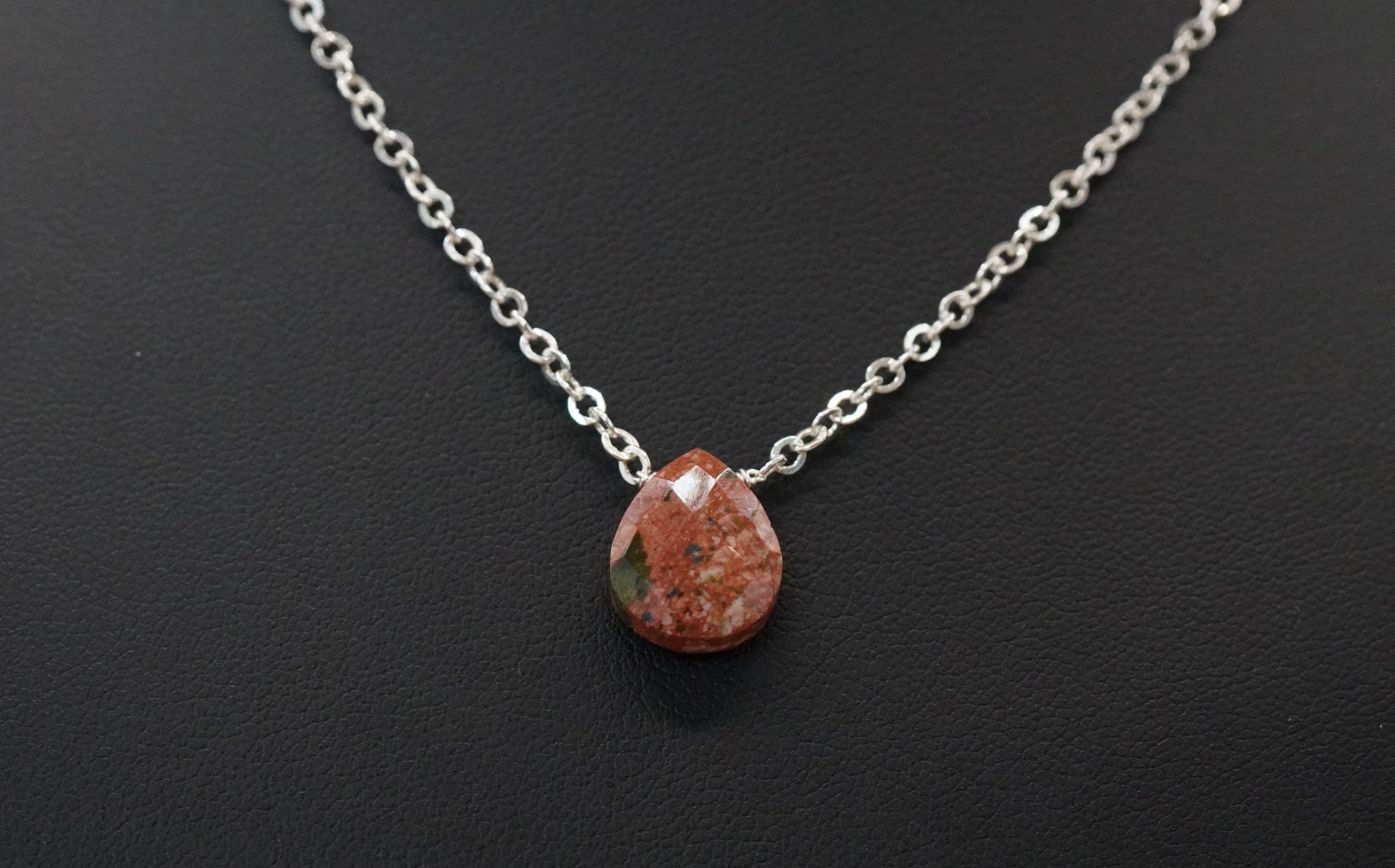 Hermoso collar de plata 0.925 con gota de unakita natural facetada. Tamaño de 43 a 49cm