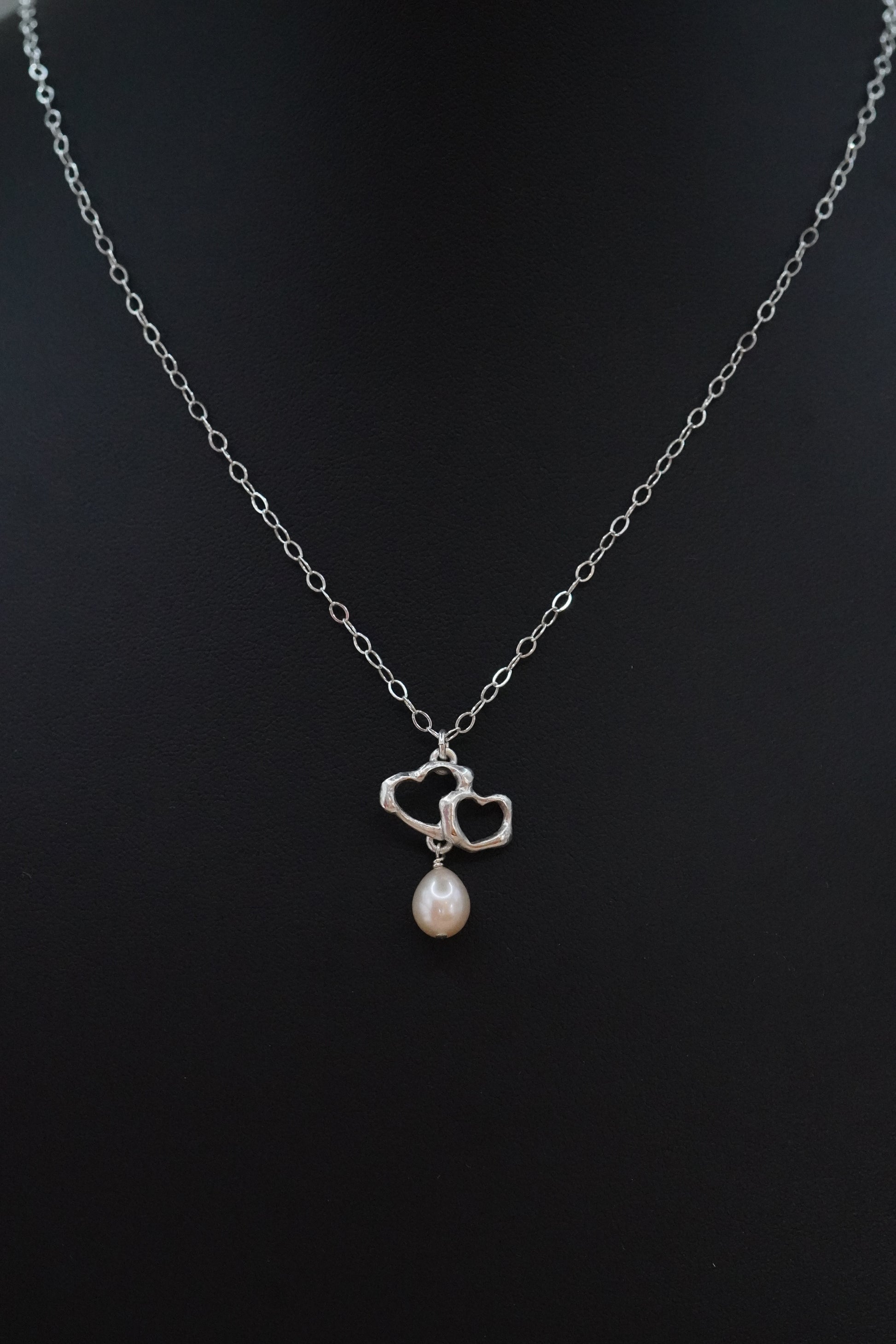 Hermoso collar hecho con restos de corazones de plata 0.925 los cuales se funden para formar una hermosa pieza de arte expresando amor. De este cuelga una perla de agua dulce.