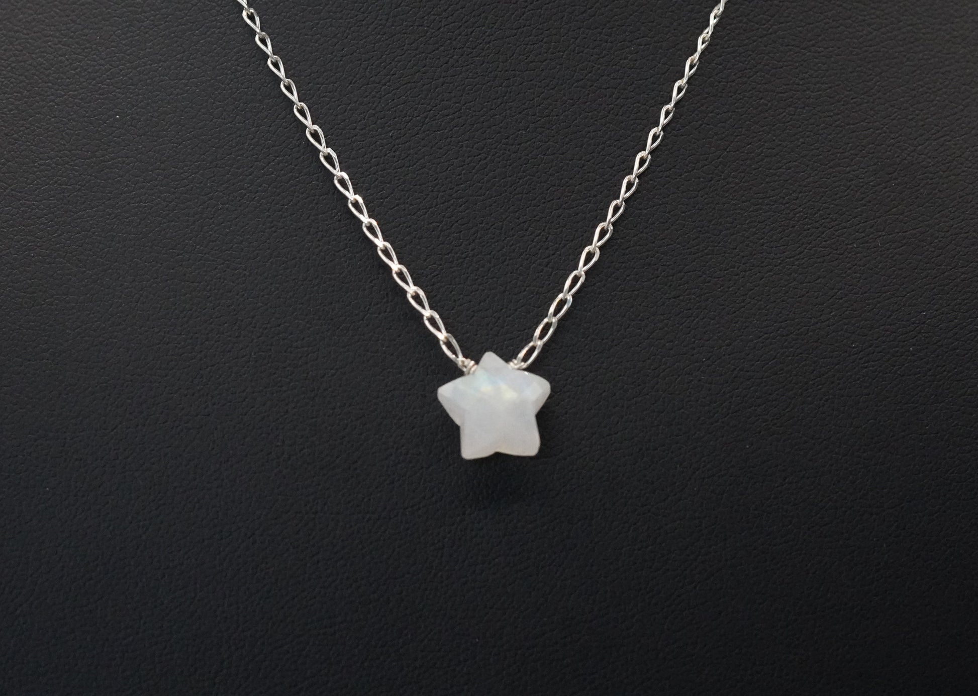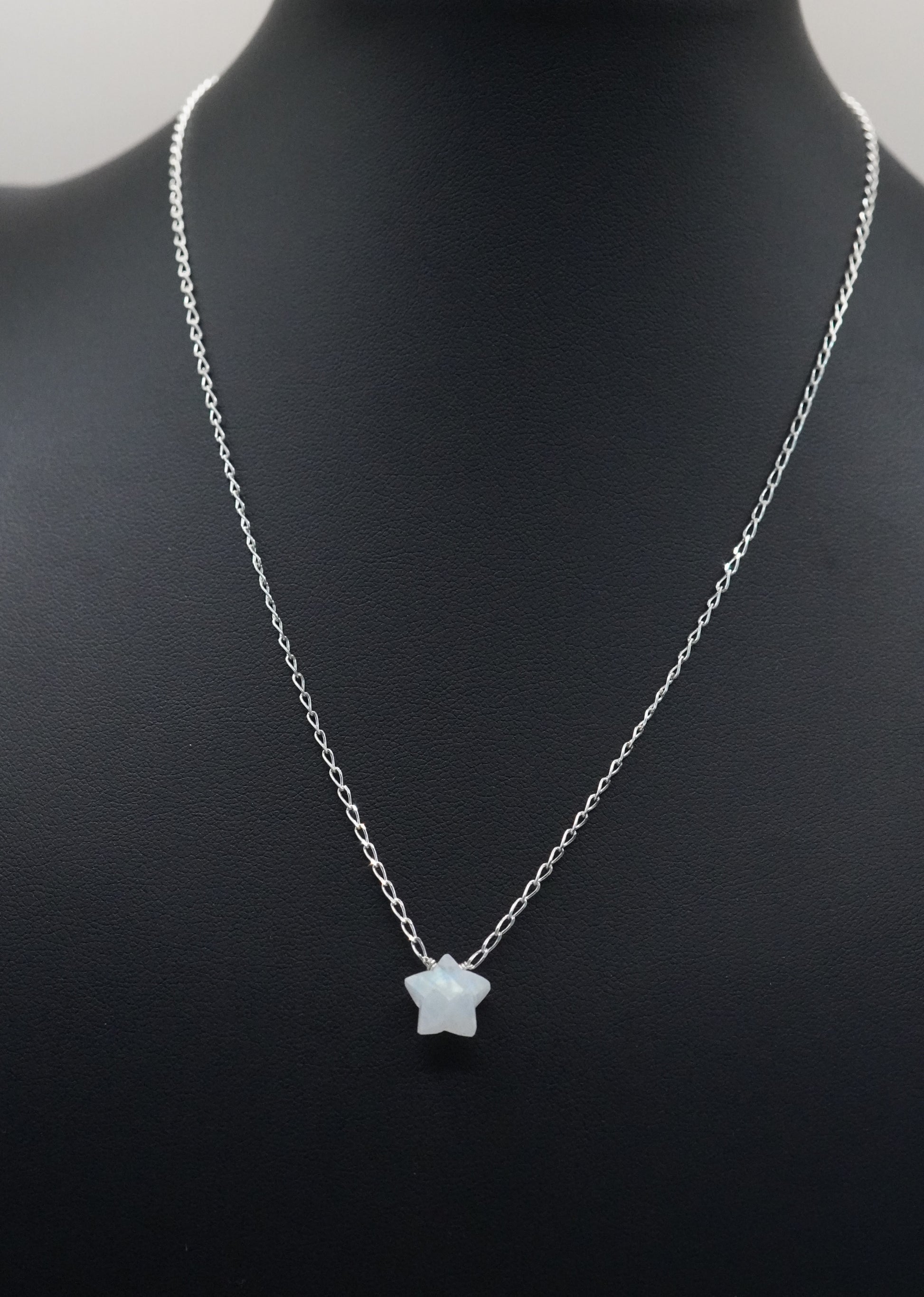 Collar de plata 0.925 muy sencillo, moderno y chic con una estrella de piedra luna de 1cm. Nota importante: Cada estrella de piedra luna es única, todas son diferentes y por su origen natural puede verse diferente que en las fotos. Tamaño aproximado de 42 a 48 con cadena alargadora.