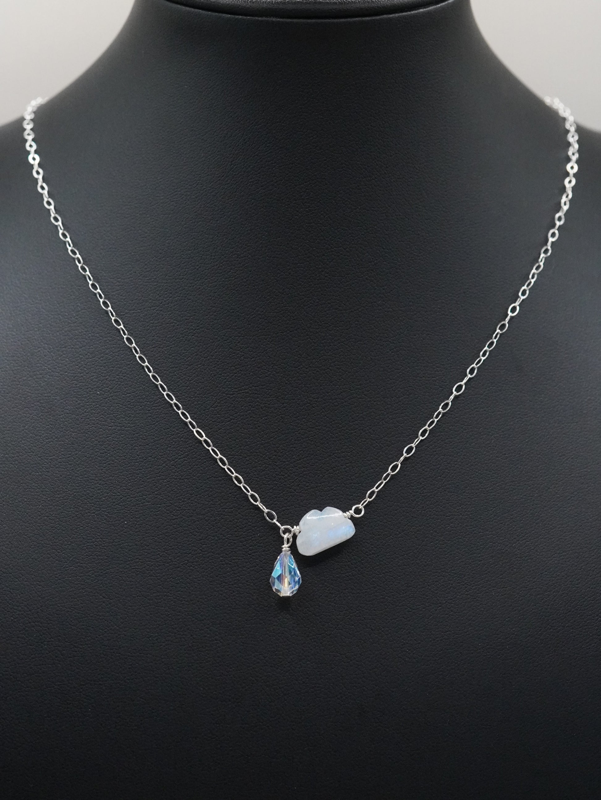 Hermoso collar de plata 0.925 con una nube de piedra luna y una gota de cristal austriaco que da un brillo muy elegante.