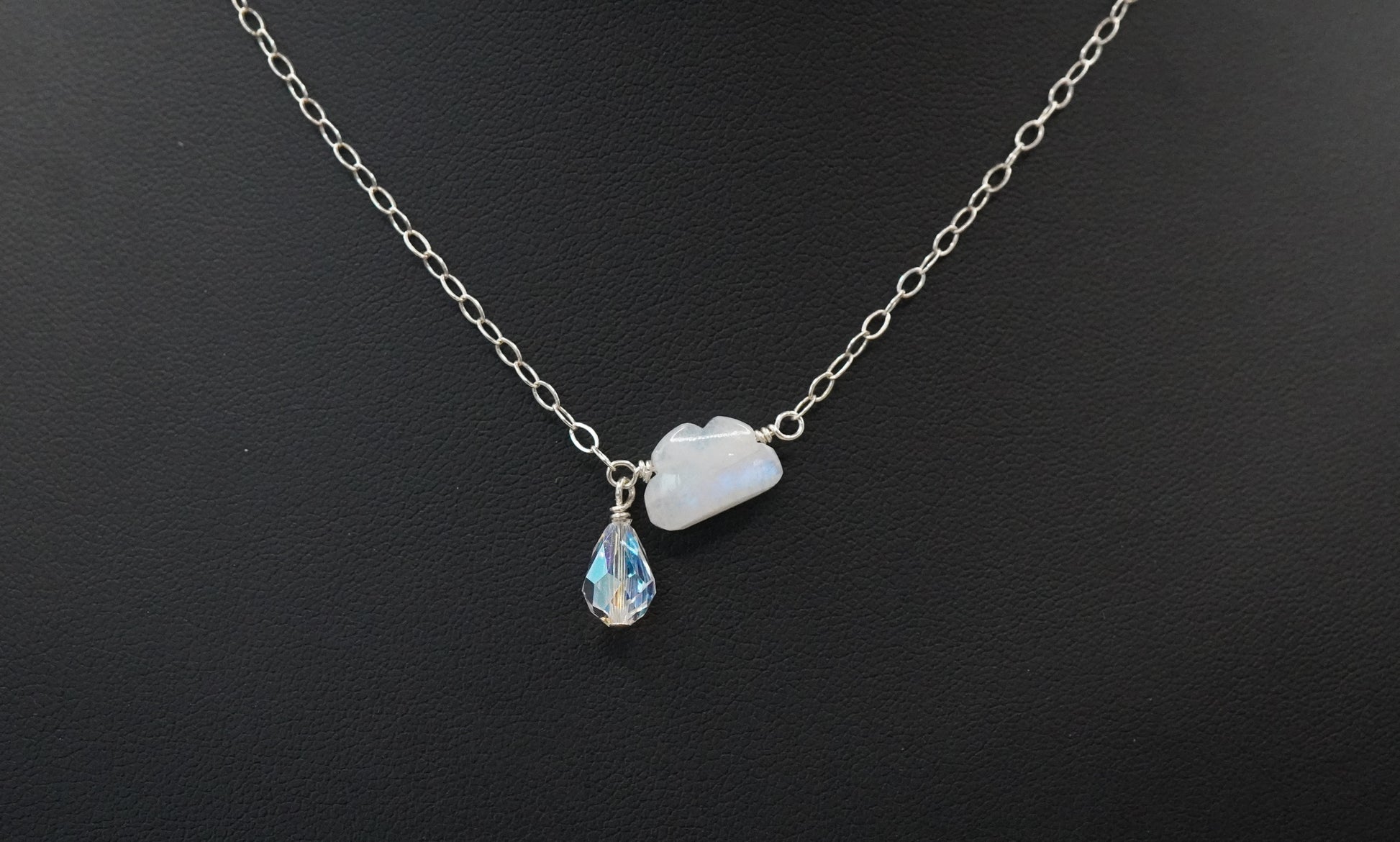 Wunderschöne Halskette aus 925er Silber mit einer Mondstein-Wolke und einem Tropfen aus österreichischem Kristall, der einen sehr eleganten Glanz verleiht.